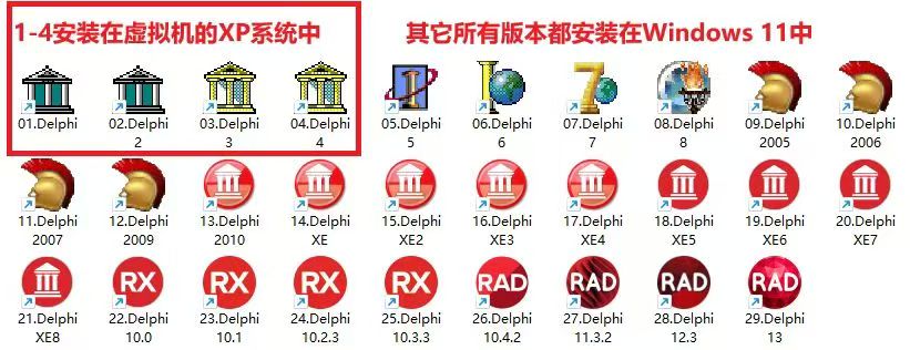 整整近三十个图标排列在屏幕上,从Delphi 1.0那经典的深蓝底色与金色字母,到最新版RAD Studio 13的现代风格设计,几乎是一部完整的可视化开发工具演变史。每一个图标都指向一个可运行的完整安装版本,从1995年到2025年,横跨整整三十年。